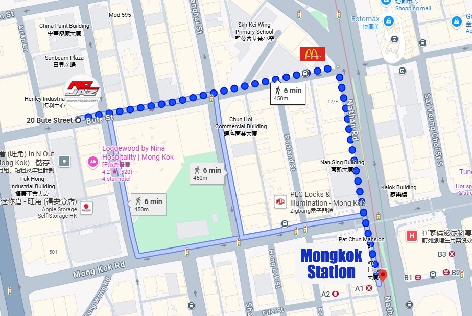 Exit at A1, turn left onto Nathan Road, and walk straight until you see McDonald's. Turn left onto Bute Street and continue straight until you reach the intersection of Bute Street and Canton Road.