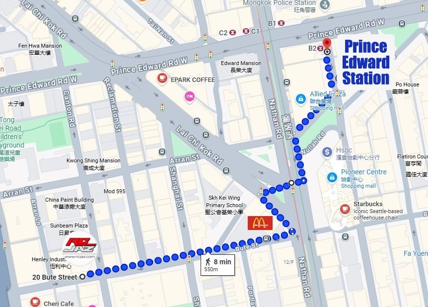 Exit at B2, walk straight and turn right onto Nullah Road towards Nathan Road. Cross to the other side of Nathan Road and you will see McDonald's. Turn right onto Bute Street and continue straight until you reach the intersection of Bute Street and Canton Road.
